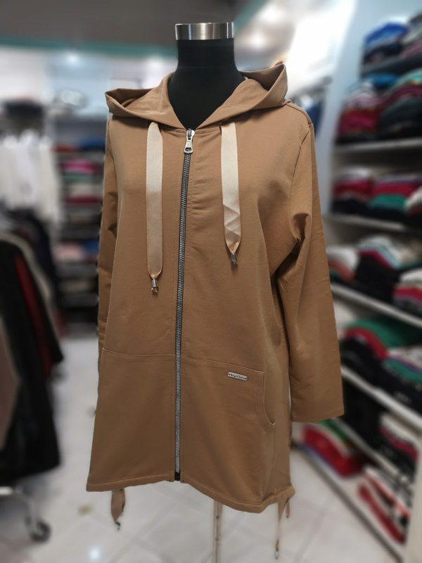 Športna ženska jopica, v rjavi barvi, je narejena iz izjemno kakovostnega bombaža. Jopa je udobna za nošenje. Jopa s kapuco ima srebrno zadrgo in na sprednji strani dva žepa.