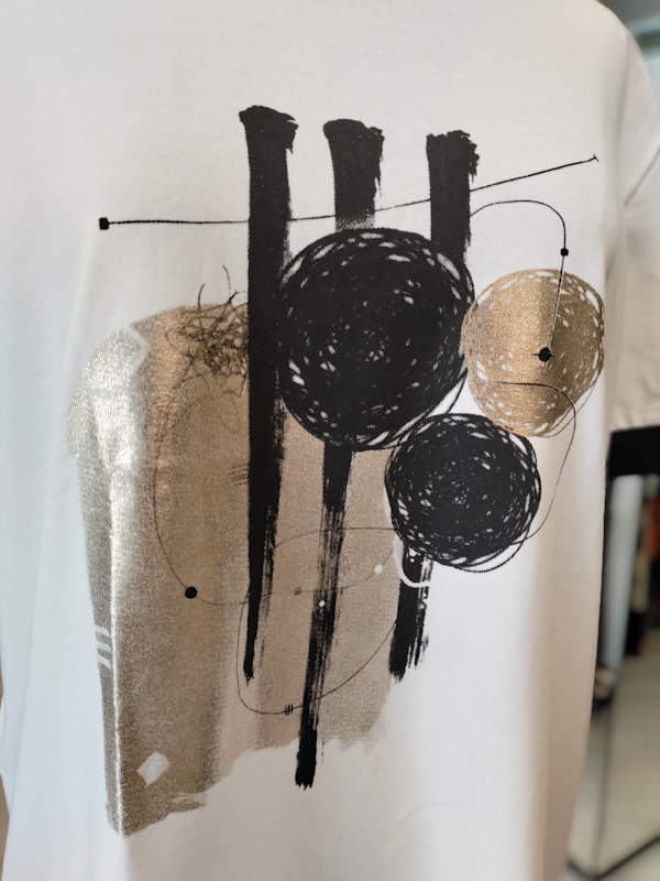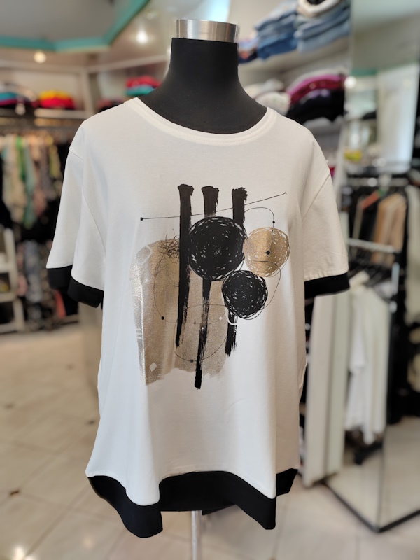 Izrazite svoj edinstven stil z modno majico T6078, ki združuje vrhunsko udobje visokokakovostnega turškega bombaža in sproščene kimono rokave. Njen odličen kroj popestrijo moderen tisk ter elegantne črne obrobe na rokavih in v spodnjem delu, kar ustvarja privlačen in prefinjen kontrast. Ta vsestranski kos zagotavlja brezhiben videz in je popolna izbira tako za sproščen vsakdan kot za posebne priložnosti.