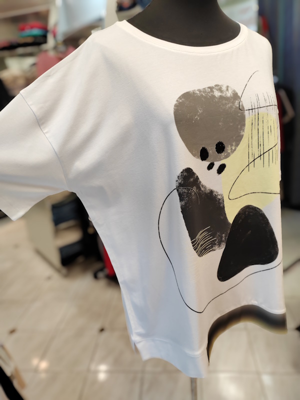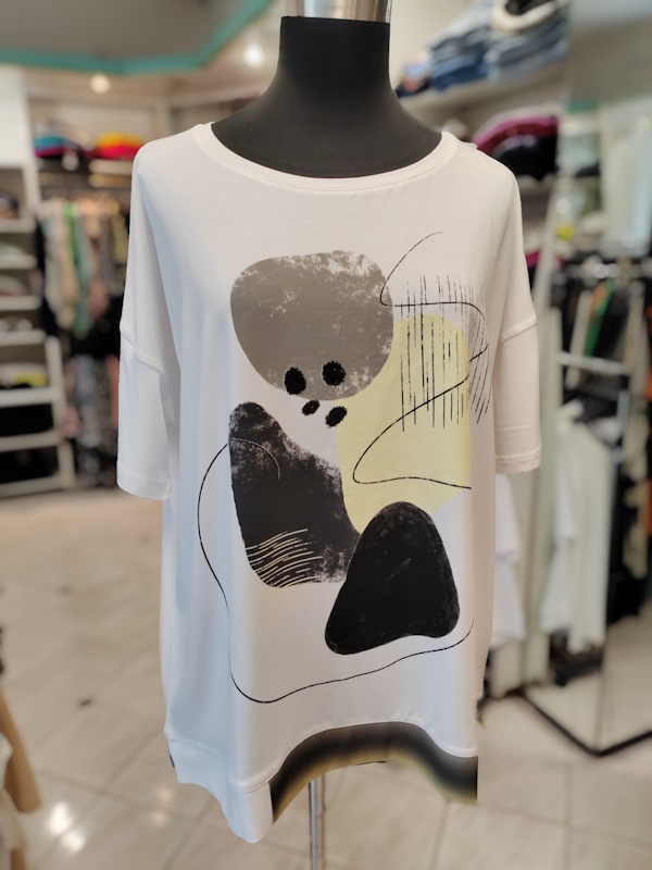 Osvežite svoj videz z modno žensko majico T6066-R v beli barvi, ki jo krasi čudovita abstraktna poslikava z zemeljskimi in rjavkastimi poudarki. Ta udoben kos je izdelan iz izredno kakovostne turške viskoze z elastanom in se ponaša z modnimi stranskimi razporki. Majica je na voljo tudi v večjih številkah in ponuja sproščen kroj, ki zagotavlja popolno udobje in brezhiben stil za vsak dan.