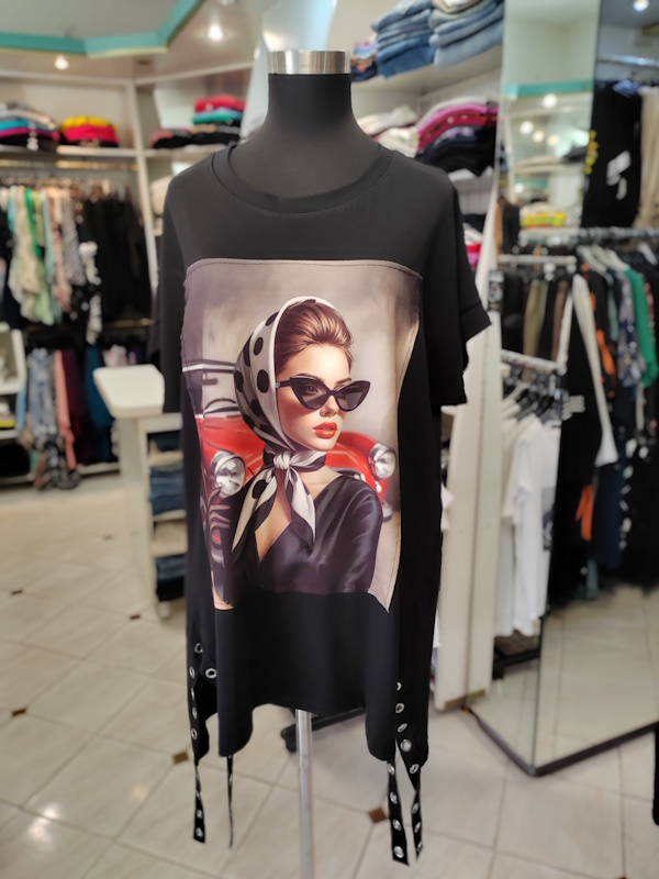 Odkrijte popolno mešanico udobja in urbane mode s črno tuniko P6056-1, ki izstopa z atraktivnim potiskom ženske s sončnimi očali in unikatnimi okrasnimi trakovi na spodnjem robu. Ta trendovski kos se ponaša z odličnim asimetričnim krojem z modno podaljšanim zadnjim delom ter udobnimi kimono rokavi, kar zagotavlja sproščeno in elegantno gibanje. Izdelana je iz prijetnega, zračnega bombaža z dodatkom elastana, njena univerzalna velikost pa poskrbi za brezhibno prileganje in šik videz za vsak dan.