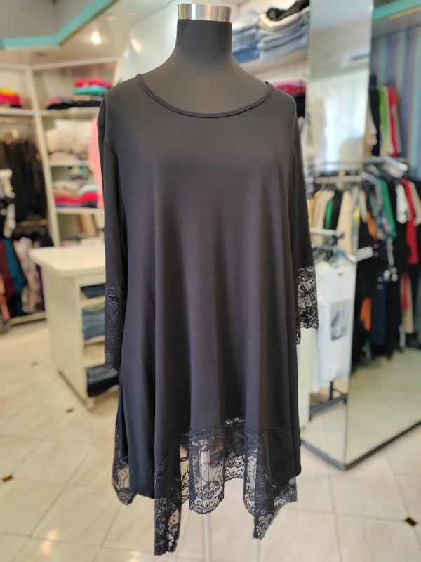 Tunika s 3/4 rokavi P6047 v črni barvi je elegantna in udobna izbira za vsakdan ali posebne priložnosti. A-kroj lepo pade, čipka na rokavih in spodnjem delu pa doda ženstven in prefinjen videz; mehka sestava iz 95 % viskoze in 5 % elastana poskrbi za prijetno nošenje.