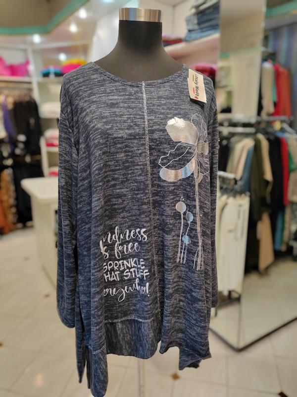 Modra tunika J5134, izdelana v Italiji, je s svojim laskavim A-krojem idealna izbira za dame z močnejšo postavo (velikosti 46-50). Izdelana je iz mehke viskoze, ki lepo pade ob telesu, poseben čar pa ji doda moderna svetleča poslikava