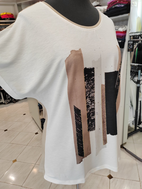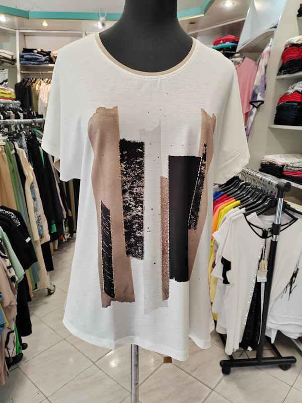 Modna ženska majica, turške kakovosti, navduši s čudovitim tiskom in bleščečimi kamenčki, ki dodajo pridih glamurja. Izdelana je iz izredno kakovostnega materiala, ki je lahek, zračen in prijeten za nošenje. Kimono rokavi ter črna hrbtna stran ustvarjajo moderen kontrast in lepo silhueto. Majica je popolna izbira za eleganten vsakdan ali posebne priložnosti.
