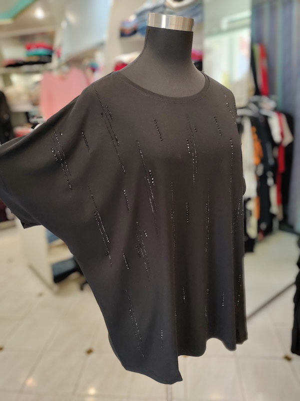 Poudarite svojo eleganco z modno žensko majico T6062 v brezčasni črni barvi, ki jo krasijo prefinjeni kamenčki in udobni kimono rokavi. Izdelana iz izredno kvalitetne viskoze, ta majica z razporki ob straneh čudovito pade ob telesu in zagotavlja popoln kroj za večje konfekcijske številke (50-54). Odkrijte vrhunsko udobje in šik videz v enem kosu, ki je nepogrešljiv za vsako priložnost.- Sestava: 95% viskoza, 5% elastan