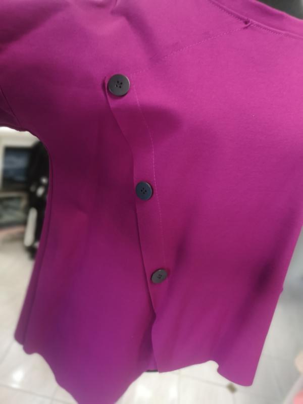 Ženska majica J5018 prinaša moderen pridih s svojo asimetrično linijo in dekorativnimi gumbi. Izdelana je iz mehke mešanice z dodatkom elastana, zato je udobna in hkrati dovolj raztegljiva za lepo prileganje.