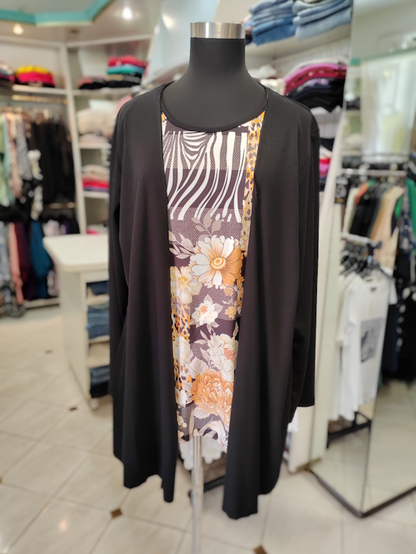 Poudarite svojo prefinjenost z žensko majico P6059 v črni barvi, ki ponuja inovativen slojevit videz z elegantno črno jopo in čudovitim vzorčastim vložkom, združenima v en sam udoben kos oblačila. Zasnovana je iz kakovostnega, mehkega materiala, ki lepo pade ob telesu, univerzalna velikost (za številke 44-46) pa poskrbi za udobno nošenje in moden videz brez truda ob vsaki priložnosti.