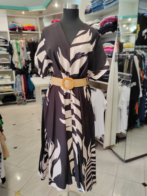 Ženska obleka P6051 navduši z elegantnim vzorcem, ženstvenim V-izrezom in modernimi kimono rokavi, ki poskrbijo za brezčasen in urejen videz.