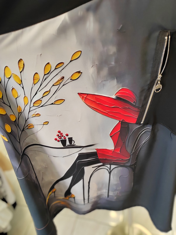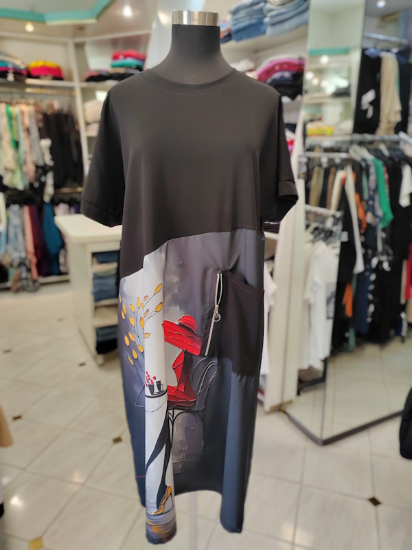 Popestrite svojo garderobo z vsestransko črno žensko obleko oziroma tuniko P6053, ki izstopa z atraktivno poslikavo na spodnjem delu in v vaš vsakdan vnese pridih urbane mode. Izdelana je iz udobne in trpežne mešanice bombaža, poliestra in elastana ter se ponaša z odličnim krojem in praktičnimi žepi, njena univerzalna velikost pa zagotavlja sproščeno prileganje za brezhiben videz ob vsaki priložnosti.